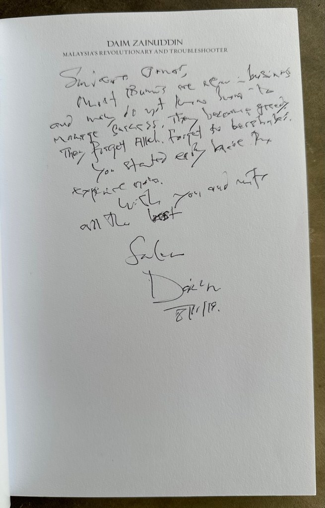 Saudara Omar, Most bumis are not in business and most do not know how to manage success. They become greedy. They forget Allah. Forget to bershukur. You started early and have the experience now. Wish you and the wife all the best. Salam, Daim 8/11/19. Early yesterday morning, Tun Daim Zainuddin, 86, passed away after a long illness. There will be much ink spilled about the man in the coming days.