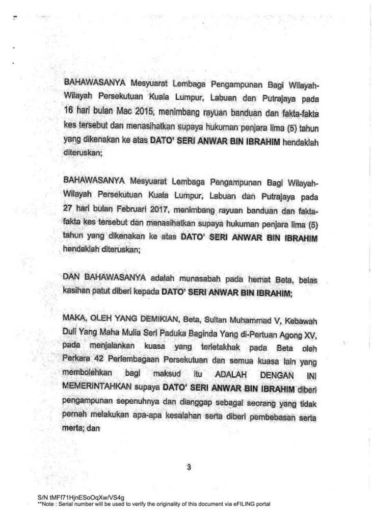 “Mesyuarat Lembaga Pengampunan tersebut telah dipengerusikan oleh Kebawah Duli Yang Maha Mulia Seri Paduka Baginda Yang di-Pertuan Agong XV Sultan Muhammad V dan turut dihadiri antaranya oleh YAB Tun Dr. Mahathir bin Mohamad sendiri selaku Perdana Menteri pada masa itu.”