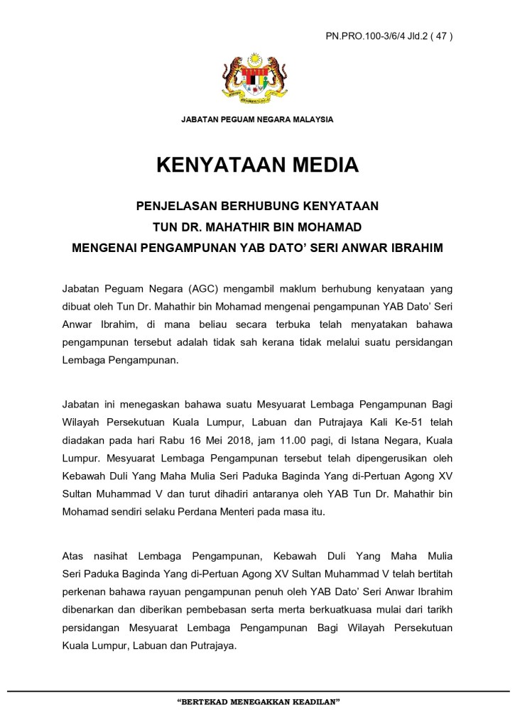 On 3 June 2025, the Attorney General’s Chambers (AGC) issued a public statement in response to Tun Dr Mahathir Mohamad’s assertion that the Royal Pardon granted to Anwar Ibrahim in May 2018 was unconstitutional. The AGC sought to correct the record, asserting that a properly constituted Pardons Board meeting did take place on 16 May 2018, and that the Prime Minister at the time, Dr Mahathir, was in attendance.