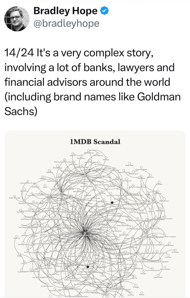 A three-word shrug.Before I published this post, I had asked a quieter question in a different context, prompted not by provocation but by something I could not ignore. Bradley Hope had shared a visually intricate map of the 1MDB scandal, intended to show the complex web of individuals and institutions involved. But two nodes were blacked out. They were not banks or jurisdictions. They were names. And they were names that, from what could be discerned, pointed not to Malaysian actors, but to figures associated with the Trump campaign.
