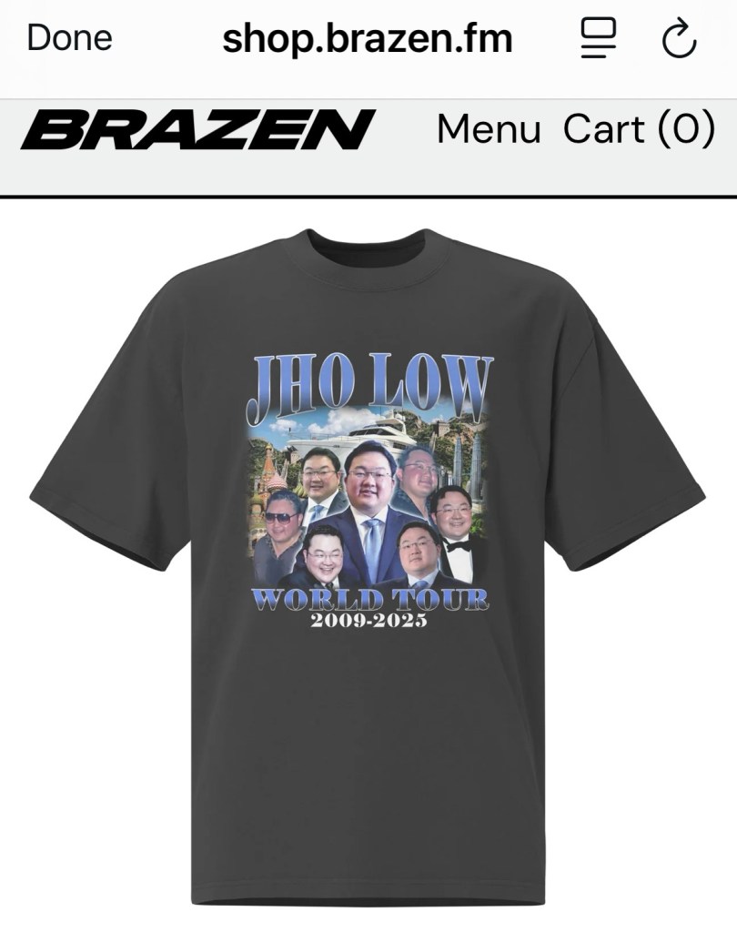 A novelty T-shirt marketed by Brazen.fm bearing Jho Low’s image and the label “World Tour 2009–2025.” Promoted on the same platform used to expose his whereabouts, the product blurs the line between justice and merchandising.This is merchandise created in the likeness of a man they claim to hold responsible for the worst act of financial pillage in Malaysia’s history. It is difficult to reconcile that moral posture with the decision to commercialise it on a novelty shirt.